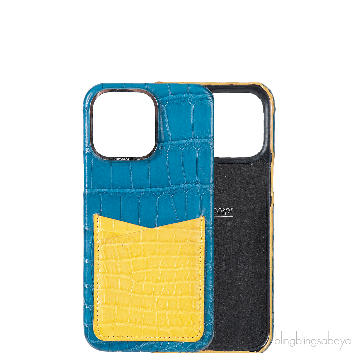 Bi-color Card Holder Blue Crocodile iPhone 15 Pro max Case from ABP Concept! This iPhone 15 Pro Max Card Holder Strap Case by ABP Concept is made from genuine green alligator leather. Designed with a yellow-hue slot on the back, it offers a stylish and convenient way to carry your essential card.