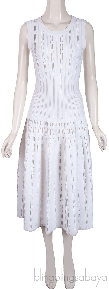 This White Stretch Sleeveless Dress from Alaia is crafted from 78% Viscose, 16% Polyester, 7% polyamide and 2% Elastane. Round neckline, sleeveless, back zip closure, and mid-length hemline are all highlights of this dress.