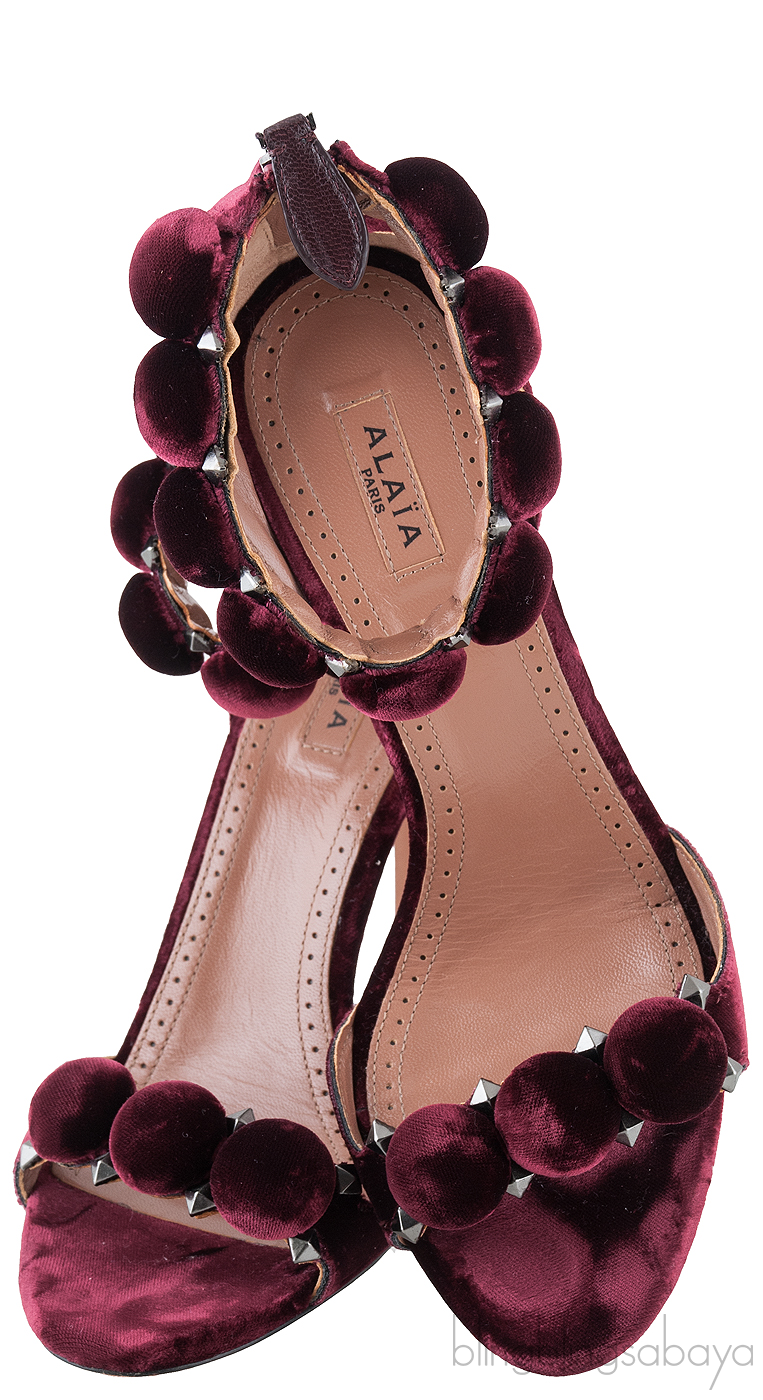 This Burgundy Velvet Bombe Heels from Alaia is beautifully crafted in sumptuous burgundy velvet fabric upper and lined brown leather. These "Bombe sandals features a round almond peep toe, hand-embellished with gunmetal studs at the ankle strap, zip fastening at the heel counter, leather lined insole, velvet covered stiletto heels measuring 110 mm high and leather sole.