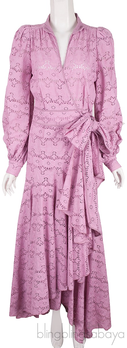 ThisPink Broiderie Anglaise Cotton Wrap Maxi Dress from Anna Mason is crafted from broderie anglaise pink cotton featuring a deep v-neckline, long sleeves with buttoned cuffs, self-tie at waist, asymmetric hemline and maxi length.