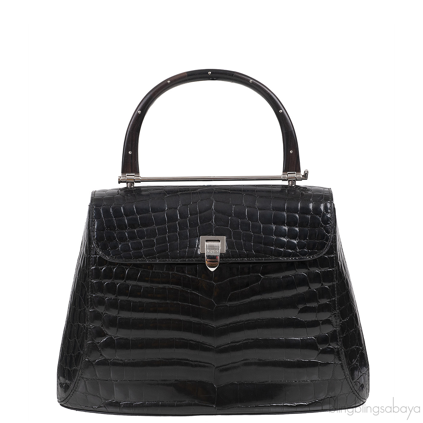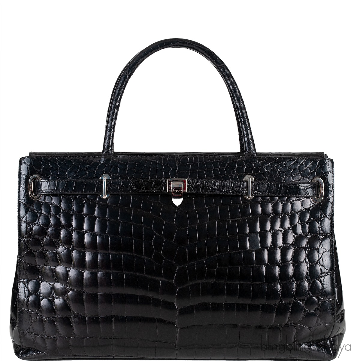 Thi functional Darcy Black Alligator Crocodile Bag provided fresh interpretation to Asprey's traditonal steamer bag. This bag is made in black crocodile skin leather adorned with palladium hardware.