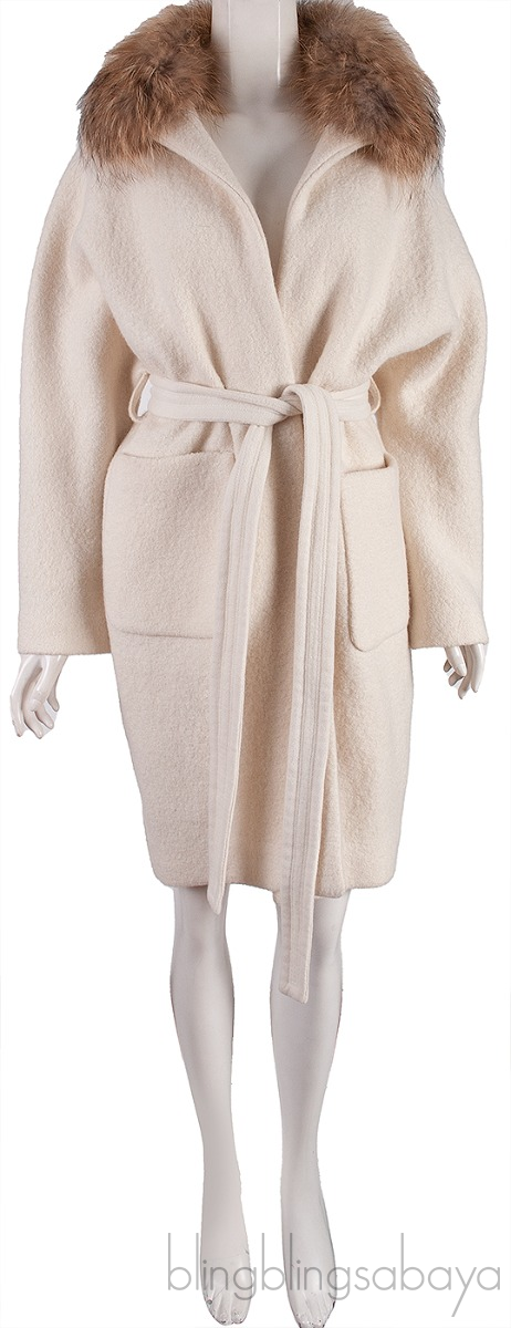 This Ecru Lady Coat Fur Collar from Ba&sh is crafted from ecru thick fabric featuring a fur collar, open fron, patch pockets, long sleeves and fabric belt to cinch the waist.