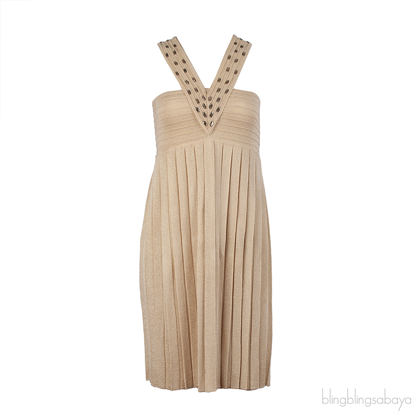 Beach Couture Halter Neck Gold Knit Pleated Dress!This Beach Couture Halter Neck Gold Knit Pleated Dress is crafted from 50% Polyester anfd 50% Polyamide in gold hue. This dress features a v-halter neck embellished with crystal, pleated mini skirt.