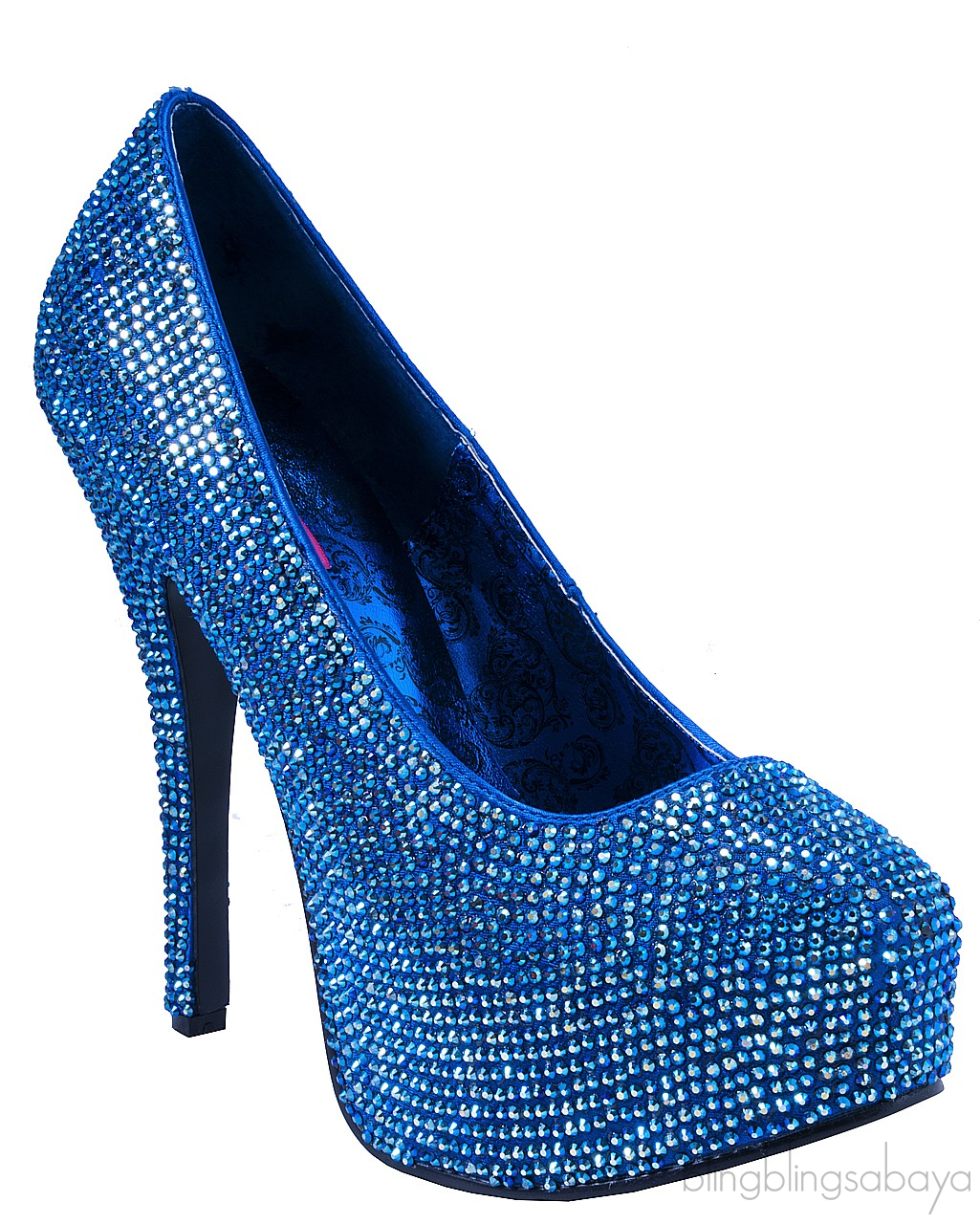 This glamorous satin blue pump from Bordello is beautifully encrusted with iridescent Rhinestone all over. This features the towering heels measuring 150 mm, printed satin insole and black rubber sole.
