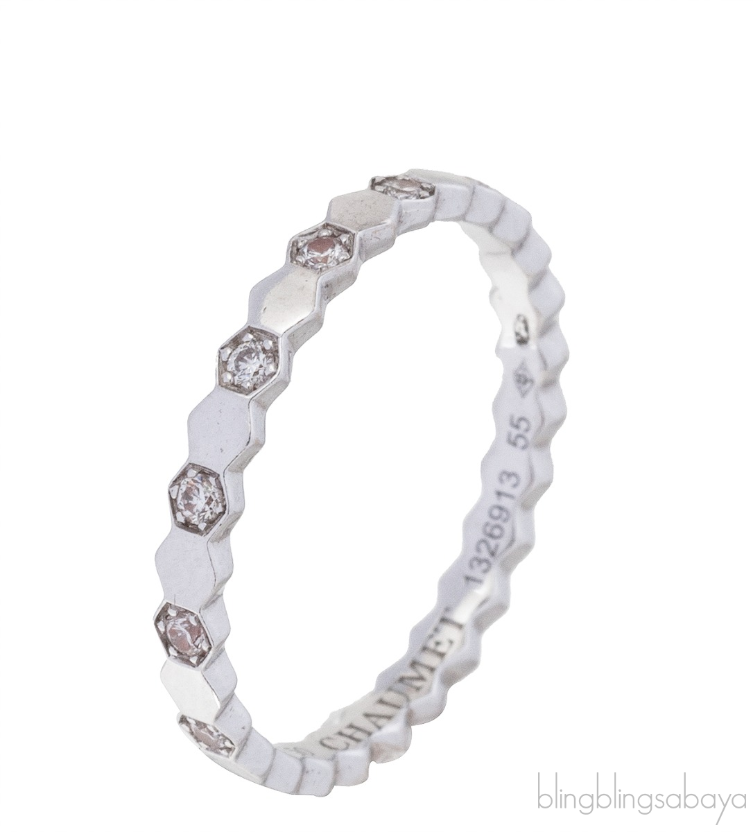 This Bee My Love White Gold Diamond Ring from Chaumt is crafted in 18 ct white gold. This ring features a geometric honeycombs motif half pave with diamonds in 2.5 mm wide.