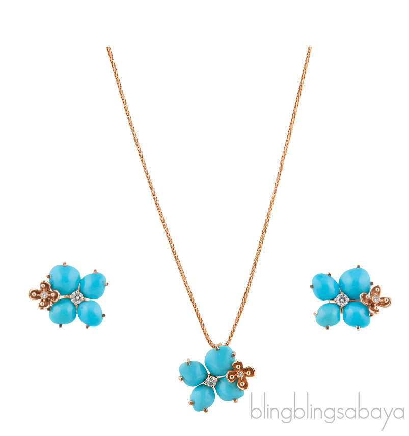 These Hortensia Eden Pendant & Earrings from Chaumet is crafted from 18 ct Pink Gold & brilliant cut Diamonds. necklace features a pink gold metal chain with three adjustments rings at 39, 42, and 45 cm. It has a lovely floral pendant in turqouise and two brilliant cut diamonds. This necklace is pared with earrings in turqouise and with four brilliant cut diamonds.