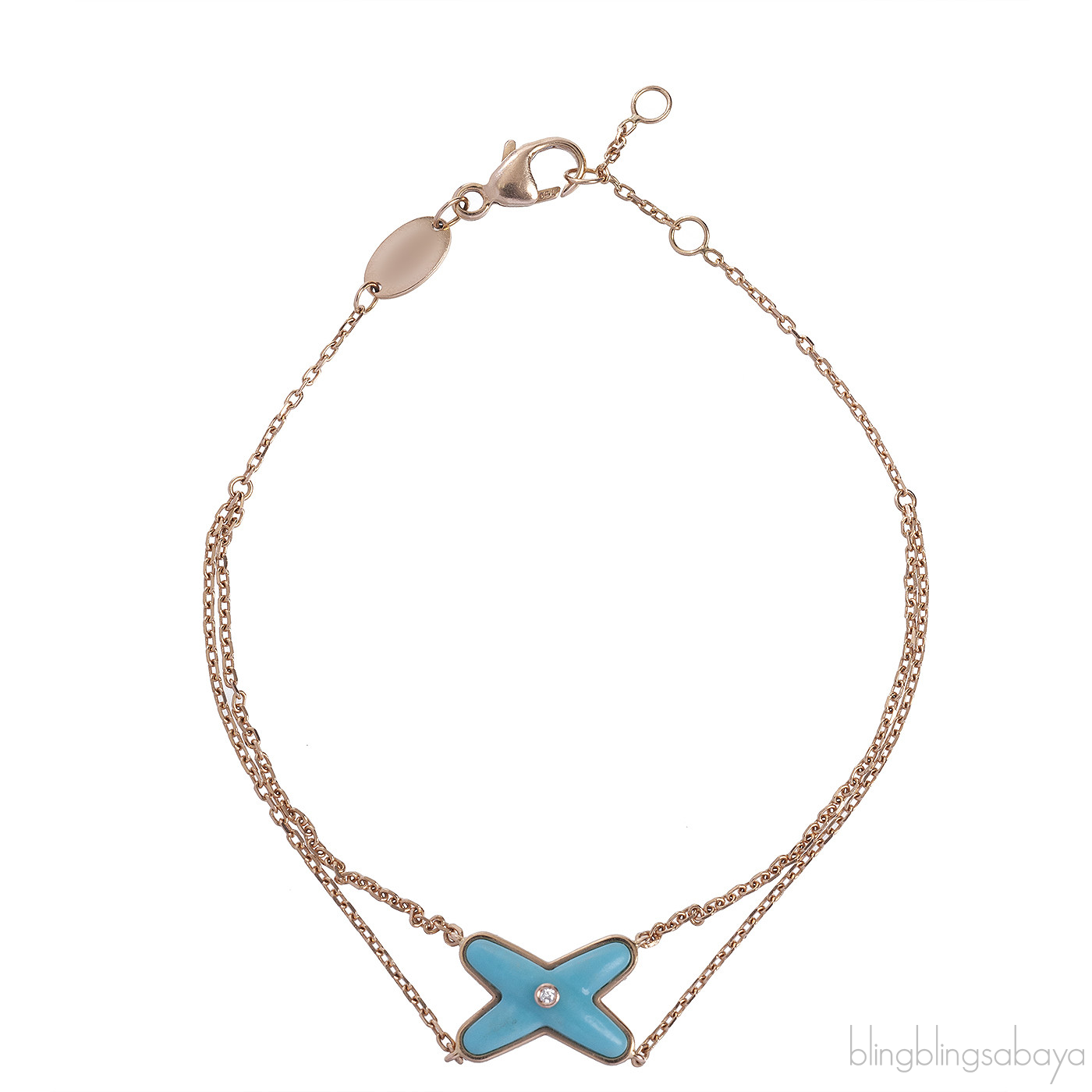 Jeux De Liens Turquoise Bracelet from CHAUMET!The Jeux De Liens Turquoise Bracelet showcases a refined turquoise cross, accentuated by a brilliant diamond at its heart, perfectly mirroring the stone's delicate hue. The 18K pink gold double chain is finished with three adjustable rings, ensuring a customizable fit from 15.5 to 17.5 cm. This stunning design effortlessly elevates any fashionable look with its sophisticated charm.