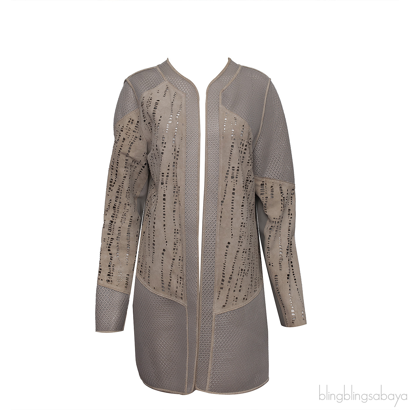 Elie Tahari Beige Perforated Mesh Leather Cardigan This Elie Tahari Beige Perforated Mesh Leather Cardigan is crafted from 100& lamb skin. 100% Polyester mesh fabric. This cardigan features open front, perforated and mesh detailing, long sleeves.