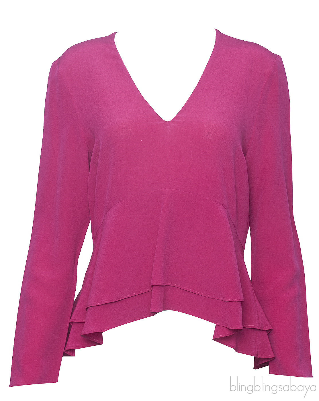 This Fuchsia Pink Peplum Top from Etro is crafted in 100% Silk fabric in plain fuchsia pink hue featuring a v-neckline, long sleeves and layered peplum desgn. Pull-over style.