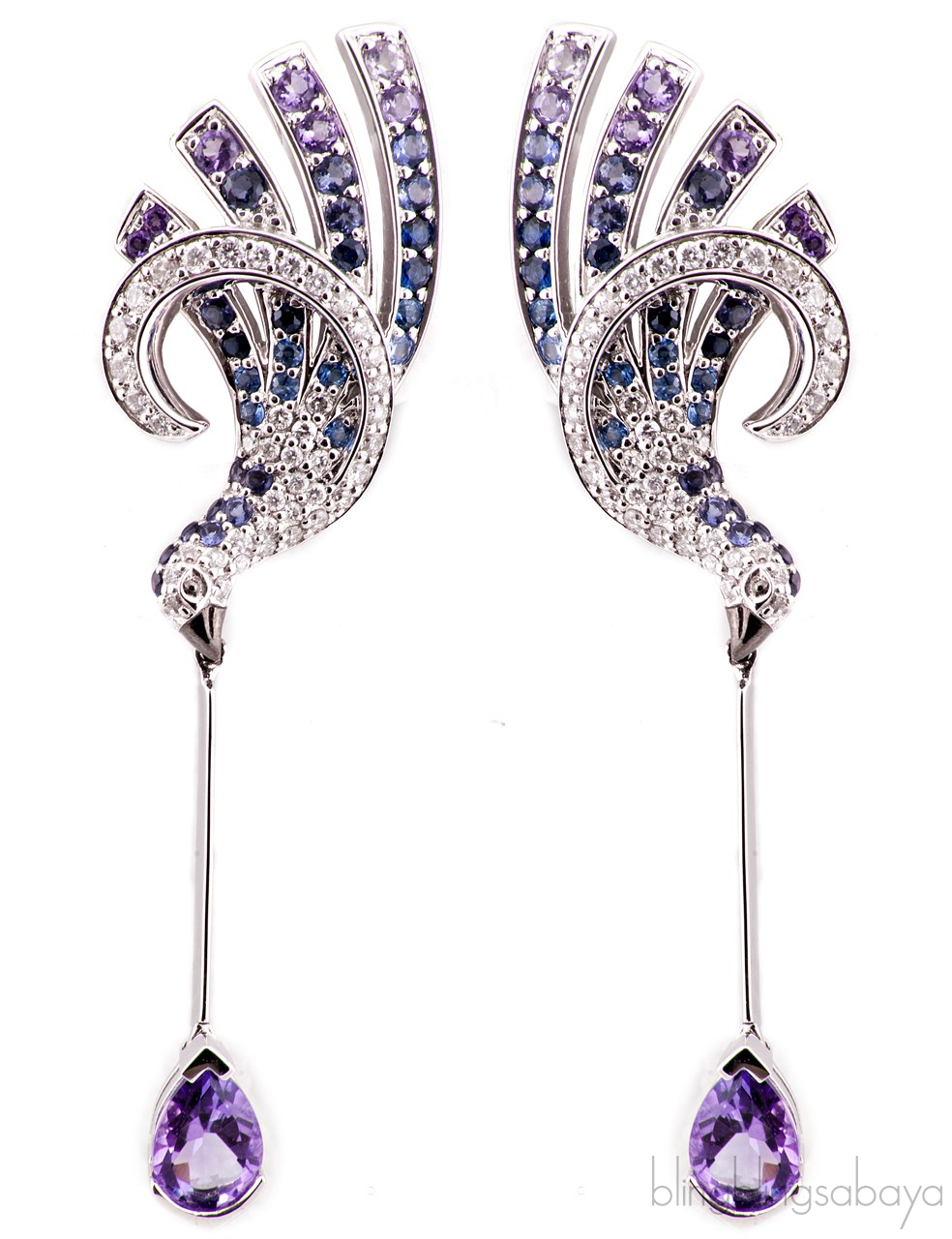 This gorgeous pair of Earrings from the designer line Tropiques by Louis Feraud is made of 18kt White Gold and precious Gemstones. The Diamond, Sapphire, Amethyst and Iolate paving enhances the harmonious curve of the bird.