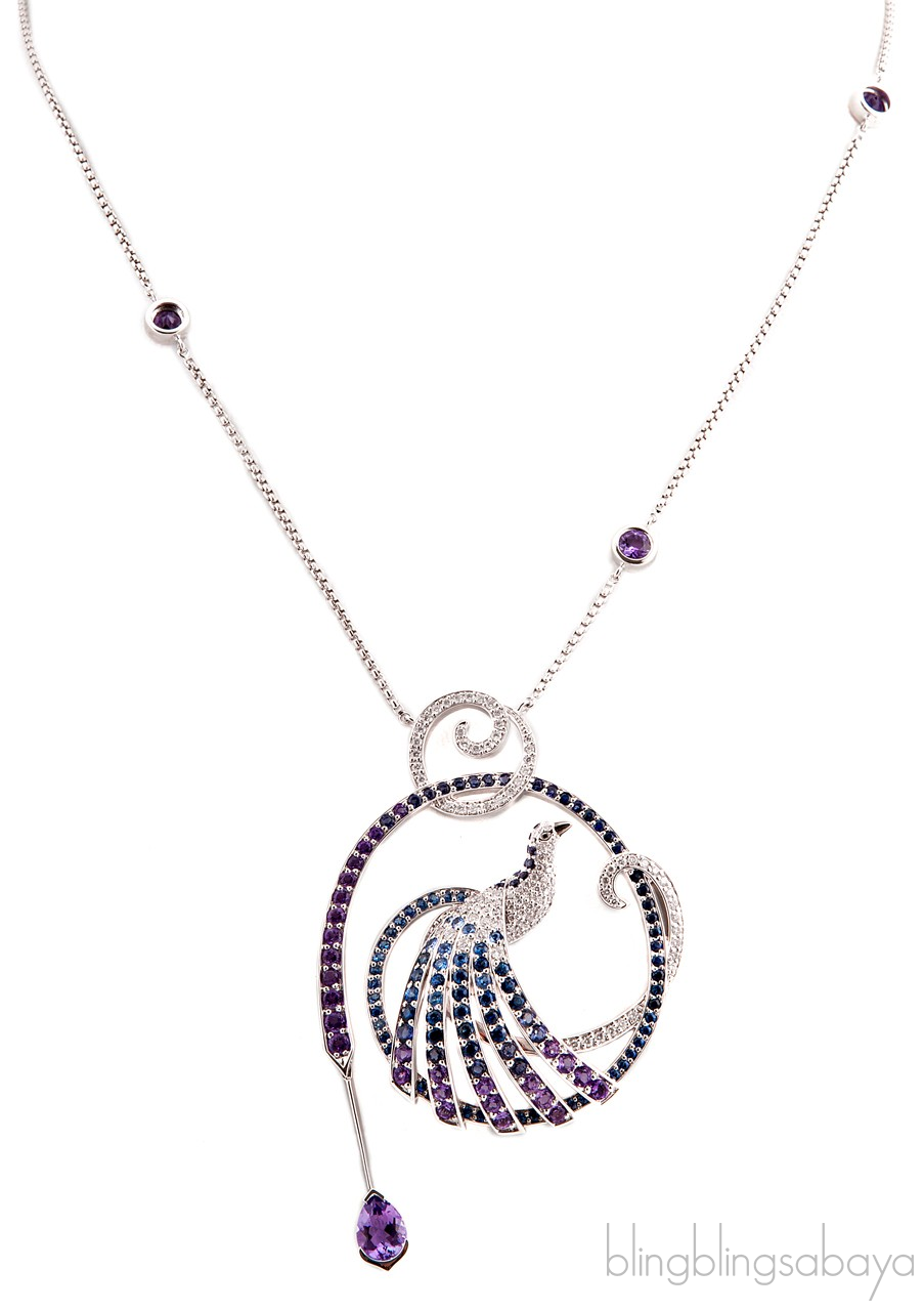 This elegant necklace from the designer line Tropiques by Louis Feraud is made of 18 KT white gold and precious gemstones. It has the intrinsic Diamond, Sapphire, Amethyst and Iolate pave work that enhances the birds harmonious curves.