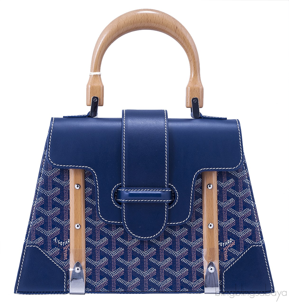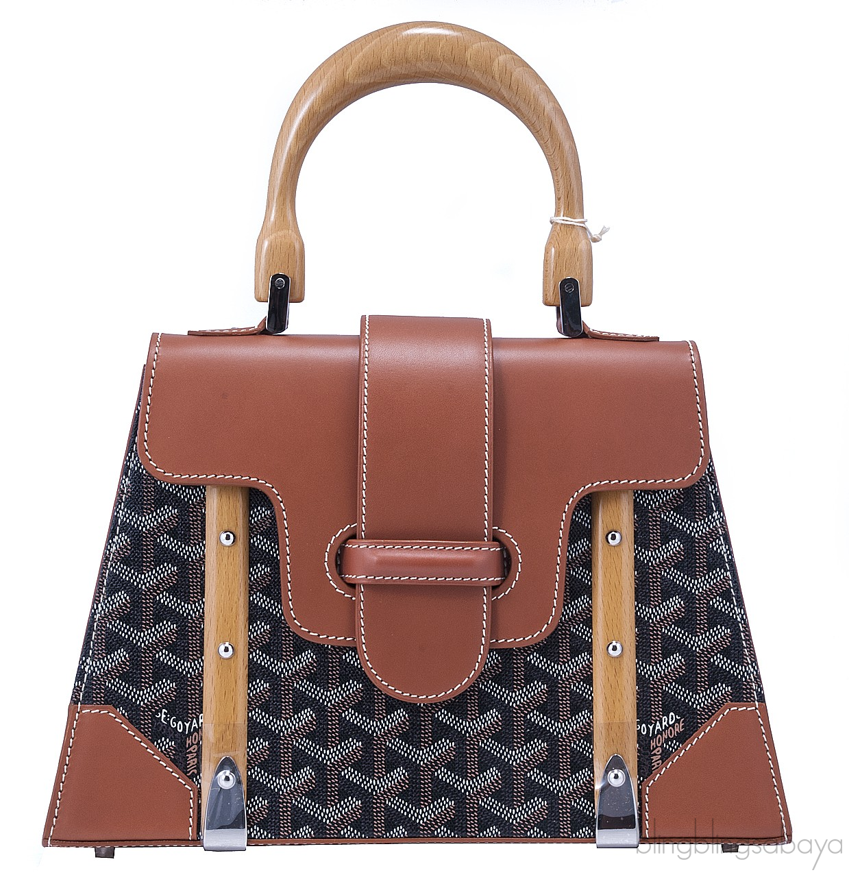 The saigon bag that features a sturdy structure is incorporated with a wooden handle and wood strips on the front. This classic timeless piece is secure by a leather flap that is belted down. Interior is lined with coordinating leather with Goyard signature stamp and has one zippered compartment inside.