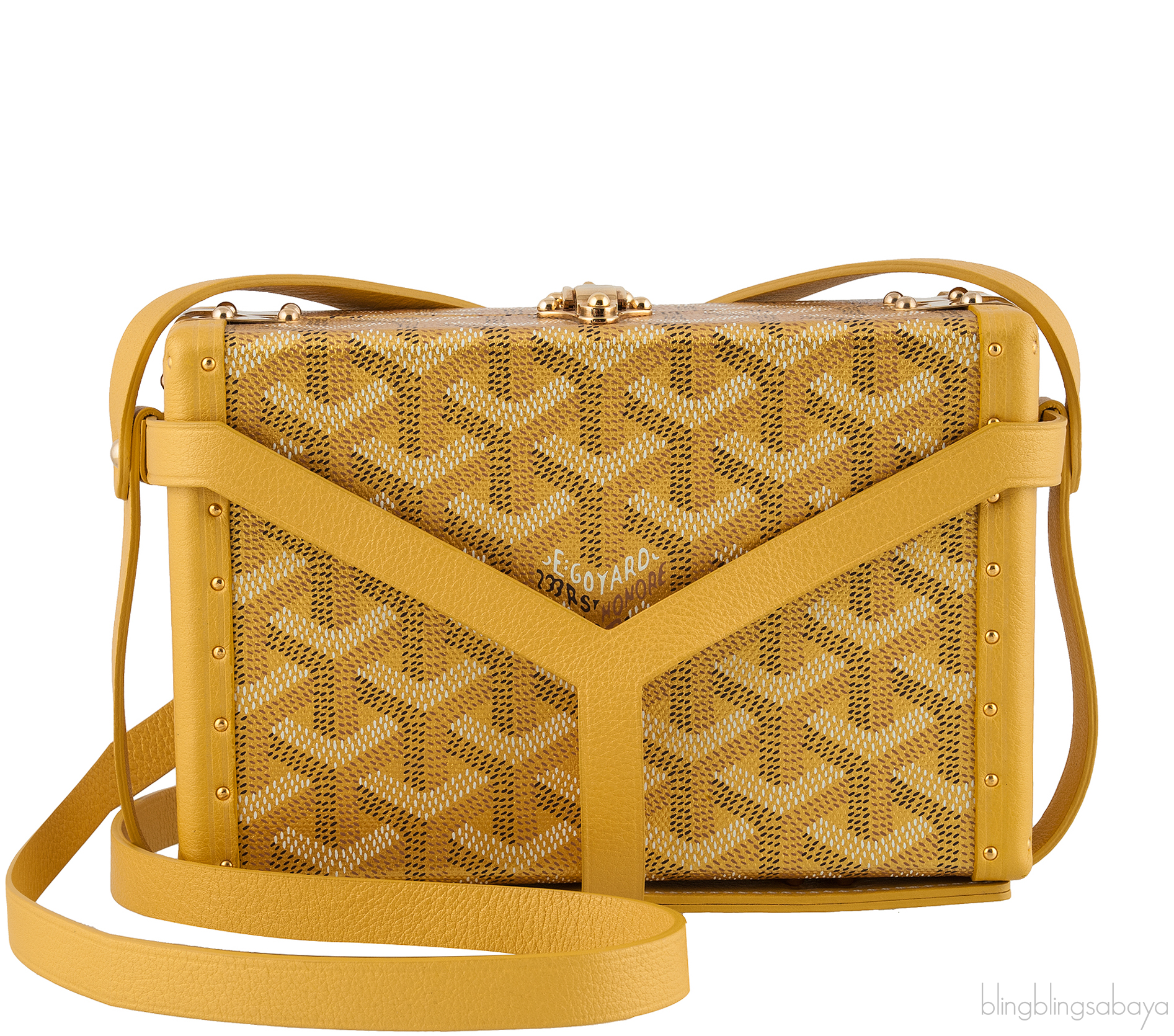 This fascinating miniature version of the Goyard trunk features a Goyard’s signature coated jacquard “Y” chevron monogram in yellow hue trimmed with coordinating leather and accented with gold hard ware. This trunk features a flip-top clasp that opens to reveal a roomy interior lined with white leather lining and with a carrying strap that turns the mini trunk into a shoulder bag.