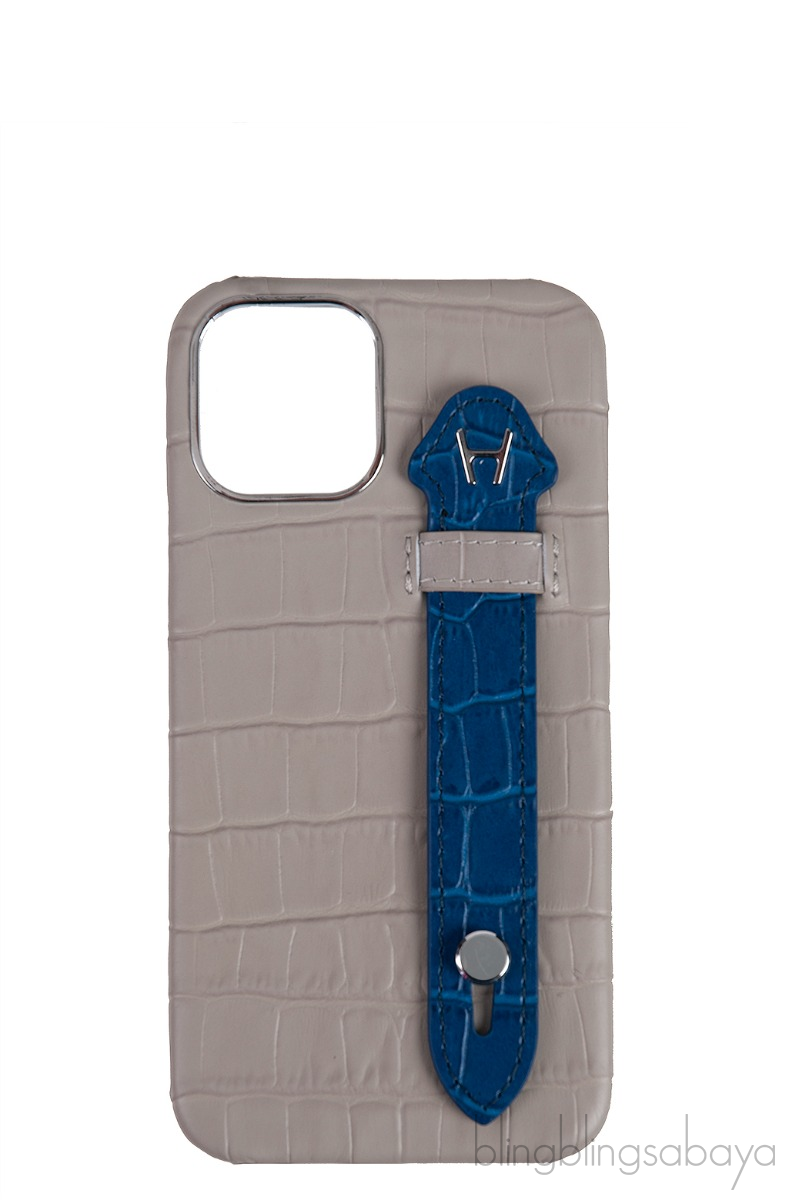 This Iphone 12 Pro Grey and Blue Crocodile Phone Case from Hadoro is luxuriously crafted from a genuine crocodile leather in grey with contrasting blue crocodile handle strap accented with the silver hardware.