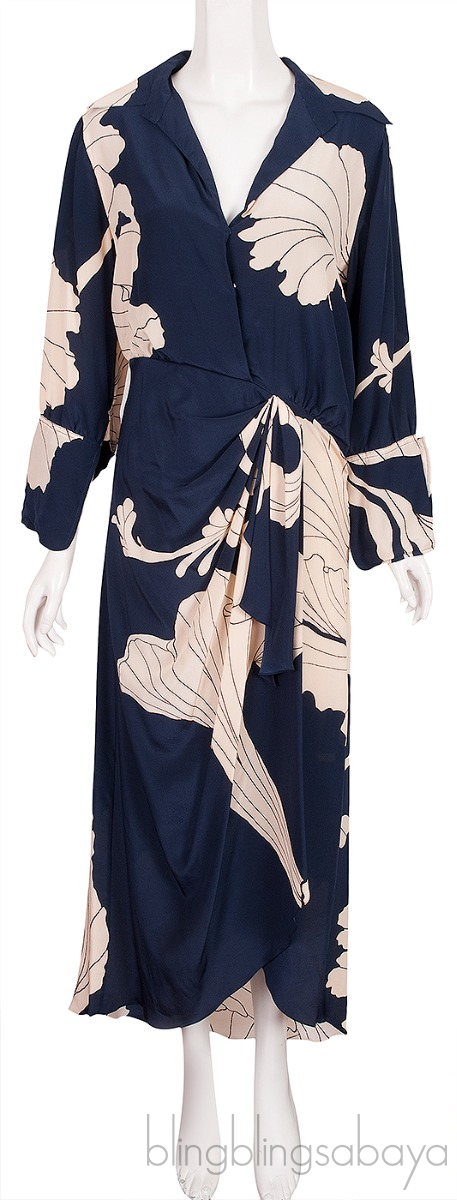 This Mysterious Grace Dress from Johanna Ortiz is crafted from 100% Silk fabric with cream floral prints and designed to an artfully draped silhouette that's gathered in a wrap-effect waist and flared at the sleeve