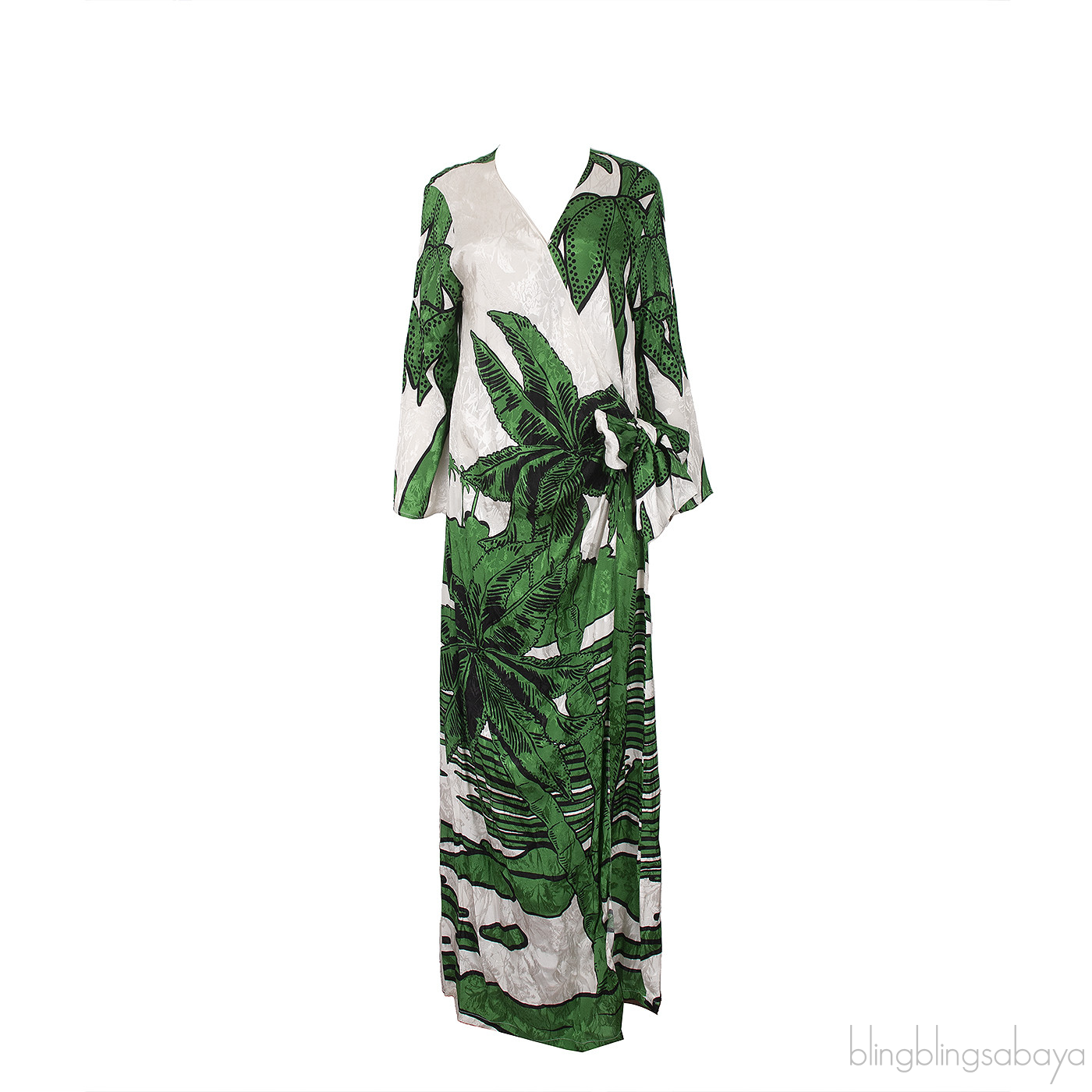 Gulf of Guinea Printed Wrap Dress from JOHANNA ORTIZ!This Gulf of Guinea Printed Wrap Dress from Johanna Ortiz is crafted from 100% Viscose. This maxi dress is ideal for beach getaways, featuring a vibrant palm tree print and jacquard-woven tropical florals. The wrap design includes wide kaftan-style sleeves and adjustable side ties for a customizable fit.