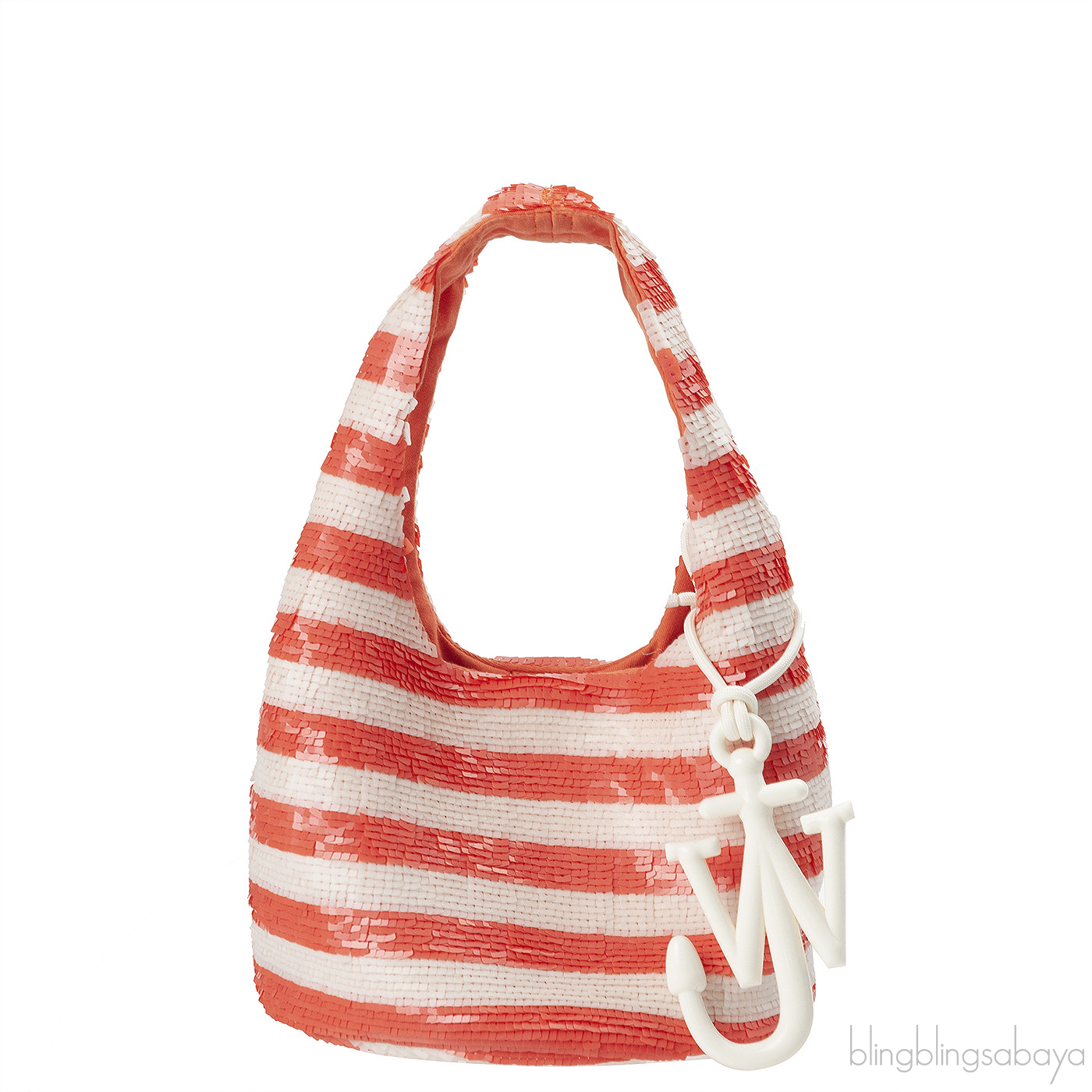JW Anderson Mini Sequin Orange White Shopper BagThis JW Anderson Mini Sequin Orange White Shopper Bag unveils a dazzling aesthetic with this tote. Adorned with white and orange sequins throughout, the bag features the brands iconic Anchor motif in white, defining it as a symbol of JW Andersons distinctive style and has interior fully lined with fabric.