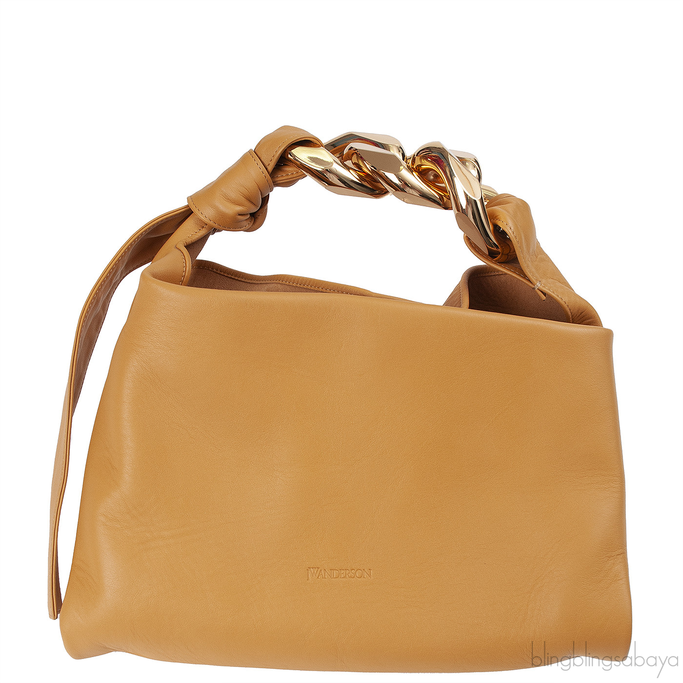 JW Anderson Beige Small Chain Hobo BagThis JW Anderson Small Chain Hobo Bag is made from beige leather and highlighted with gold-tone hardware. It features three oversized gold chain links forming the shoulder strap, an adjustable knotted detail on one side, a magnetic top closure, and a soft suede-lined interior.