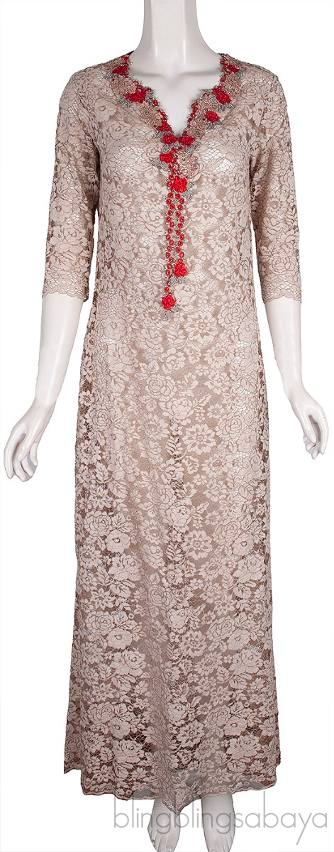 This Lace Floral Crystal Maxi Dress from Khulood Bin Arab is crafted from sheer floral lace in mocha color. This dress features a v-neckline trimmed with multicolor floral patch fully embellished with crystals, third-quarter sleeves and maxi length.