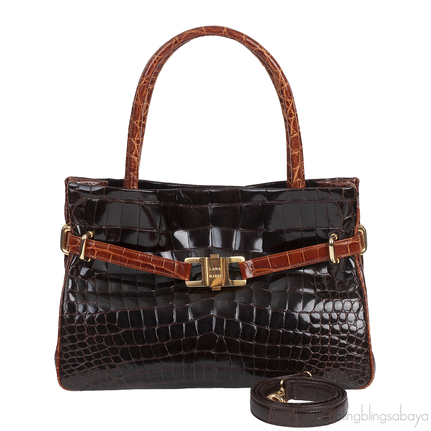 This Positano Alligator Bag from Lana Marks is made out of alligator skin accented with a gold hardware. Handcrafted in Italy recognizable for their fusion of form, beauty and function, Lana Marks handbags is investment in fashion, quality and practicality.