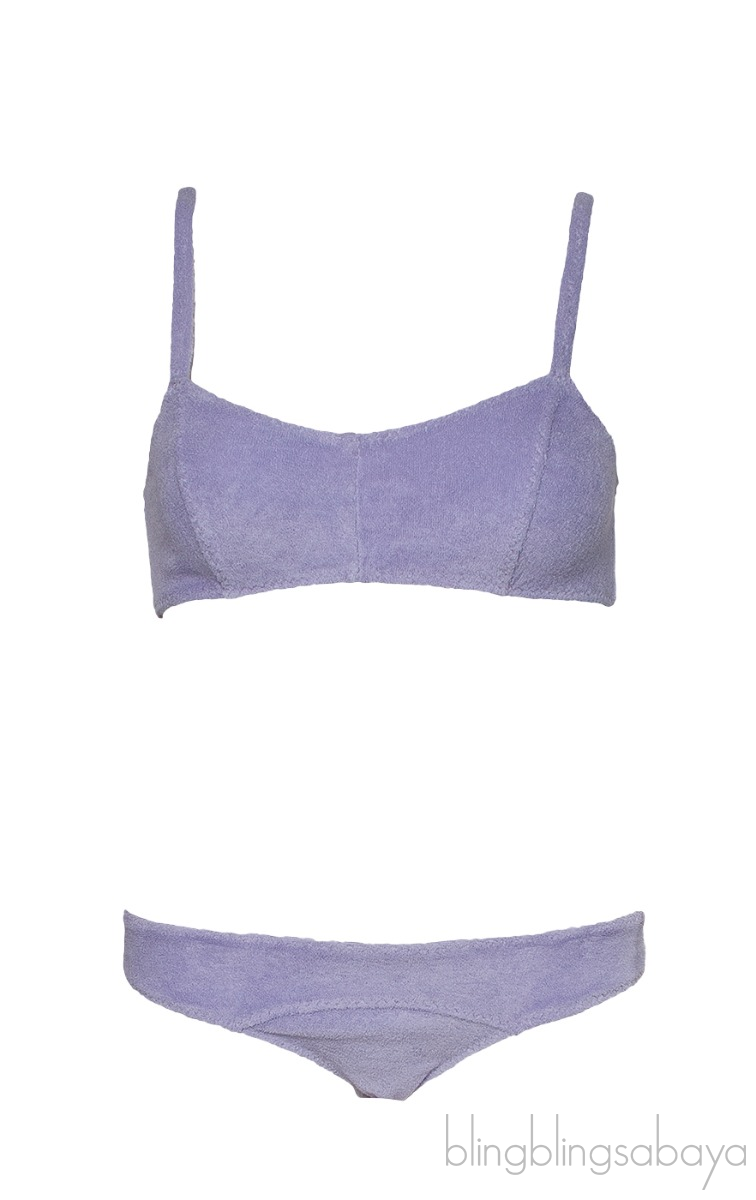 This Stretch Lilac Bikini & top from Lisa Marie Fernandez is made of 84% Cotton and 16% Polyester terry cloth fabric in lilac color. Top features a black push lock closure at back, non-padded and pair with bikin bottom