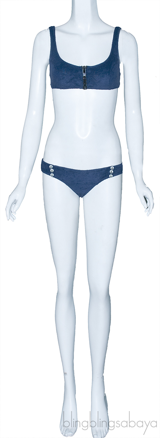 This Stretch Blue Bikini & top from Lisa Marie Fernandez is made of 84% Cotton and 16% Polyester blue terry cloth fabric exposed front zipper and white button unchor design on bikini.