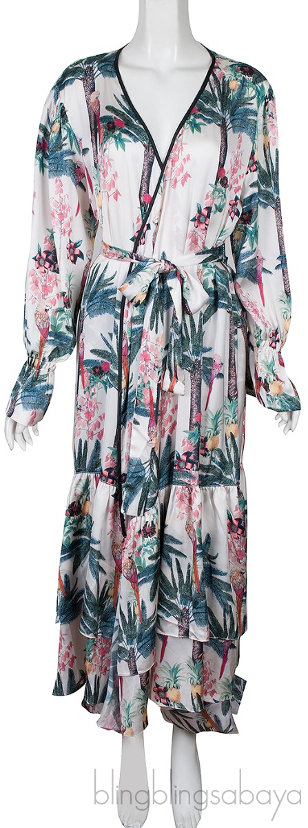This Bird Print Ruffled Kimono & Bow Pantsfrom Lobo Rosa are crafted from 100% polyester. Ruffled kimono features long sleeves with elastic on cuffs and ruffled detailing on skirt.