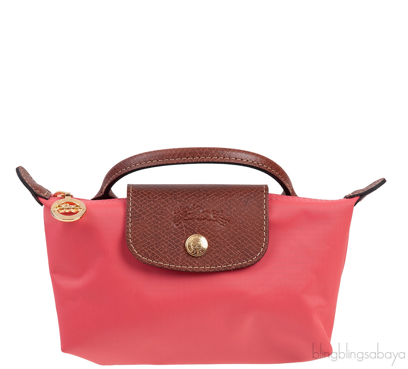 This super trend Mini Le Pliage Pouch with Handle is extremely cute and must-have pouch of today! This mini bag is crafted from recycled polyamide canvas in coral pink with inside coating and brown calfskin leather accented with gold hardware. This features a top mini handle, flap leather secure on a snap closure, top zip opening and longchamo signature zipper pull.
