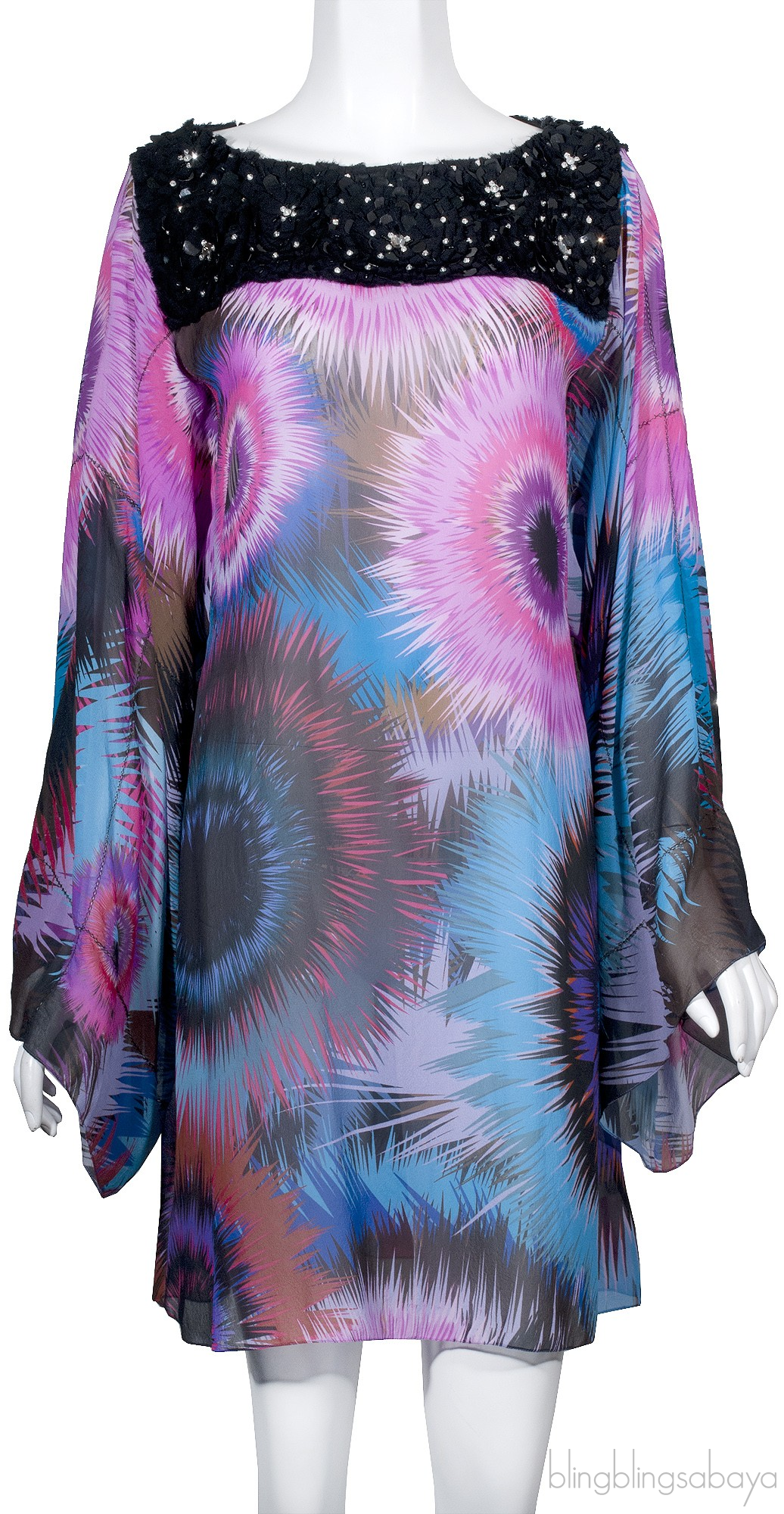 This Embellished Multicolor Dress from Matthew Williamson is made of 100% Silk fabric with multicolor abstract print. This features a silk chiffon dress with black floral embellished with crytal and sequins, bateau neckline and batwing sleeves.