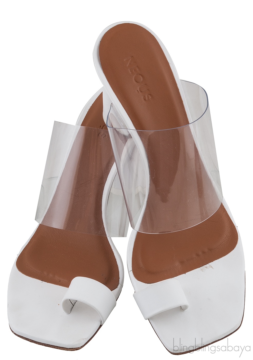 These White PVC One Finger Slide Mule from Neous are made of transparent PVC wide strap across with white leather for a toe, brown and white leather lining, white round stuck heels measuring 90 mm high and brown leather sole.