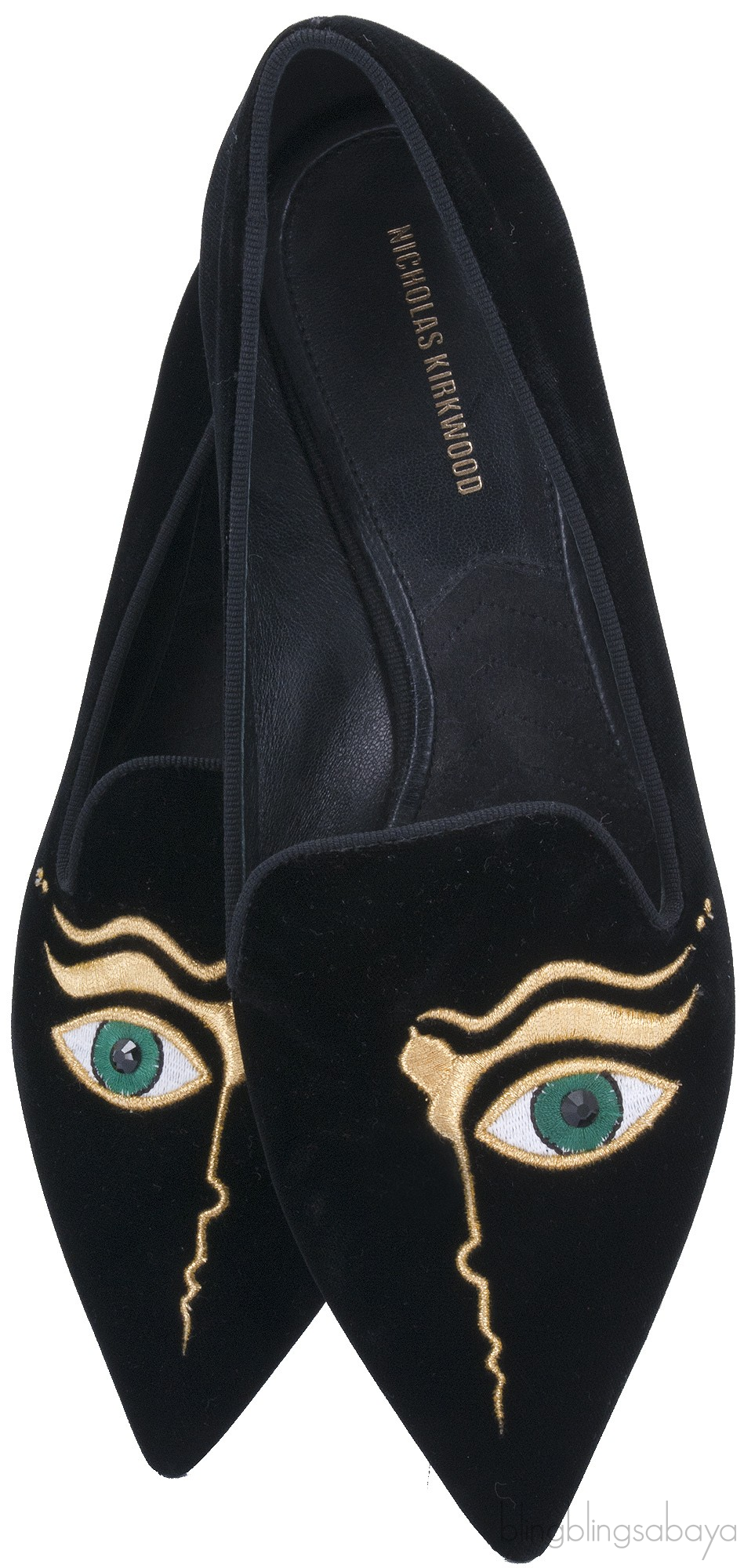 This Eye Pointed Toe Velvet Flat from Nicholas Kirkwood is crafted in black velvet upper with gross grain trimming and black leather lining featuring a slip on style shoes with pointed toe, egyptian embroidered one eye detailing on the vamp and leather sole.
