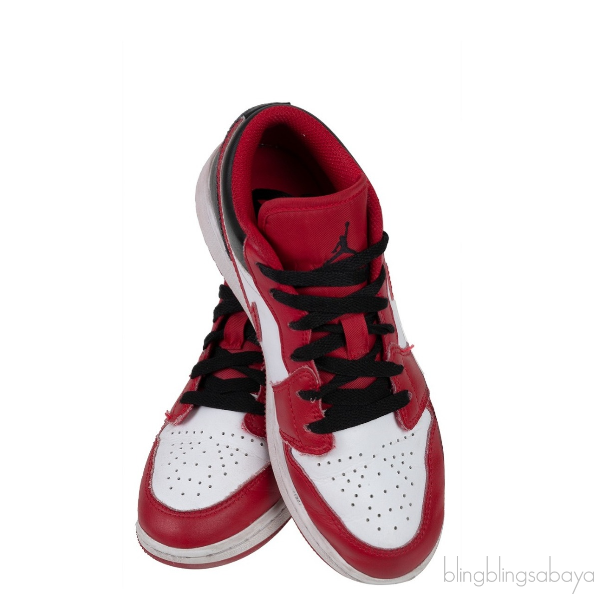 This Jordan 1 Low Top Kid Sneakers from Nike is a low-top edition of the Air Jordan 1 that sports the typical red, white, and black colors of the Chicago Bulls with a hint of black on the laces and around the ankles. The Jumpman and Air Jordan emblems are located on the tongue and heel, respectively, of these low-top sneakers.