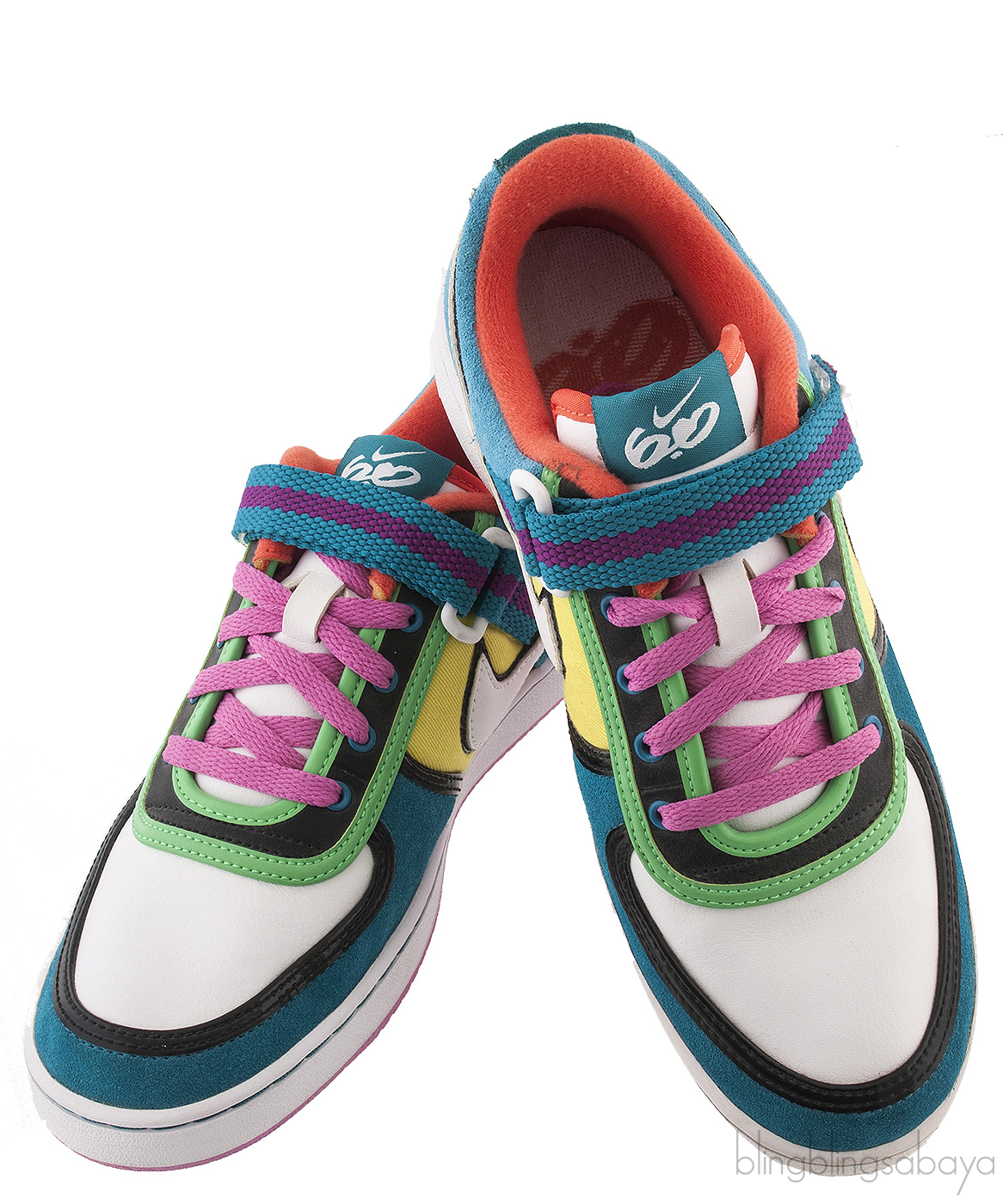 This Multicolor 6.0 Dunk Low from Nike is made of multicolor leather featuring a low cut sneakers with geometric pattern, It has the black leather trimming, white leather tongue with orange trim, turquoise heel tab, white leather toe vamp, dark green toe trimming and orange shoe collar and velcro strap. It has six eyelets pair with pink shoe laces, Nike logo2 on the insole and on the shoe sides.