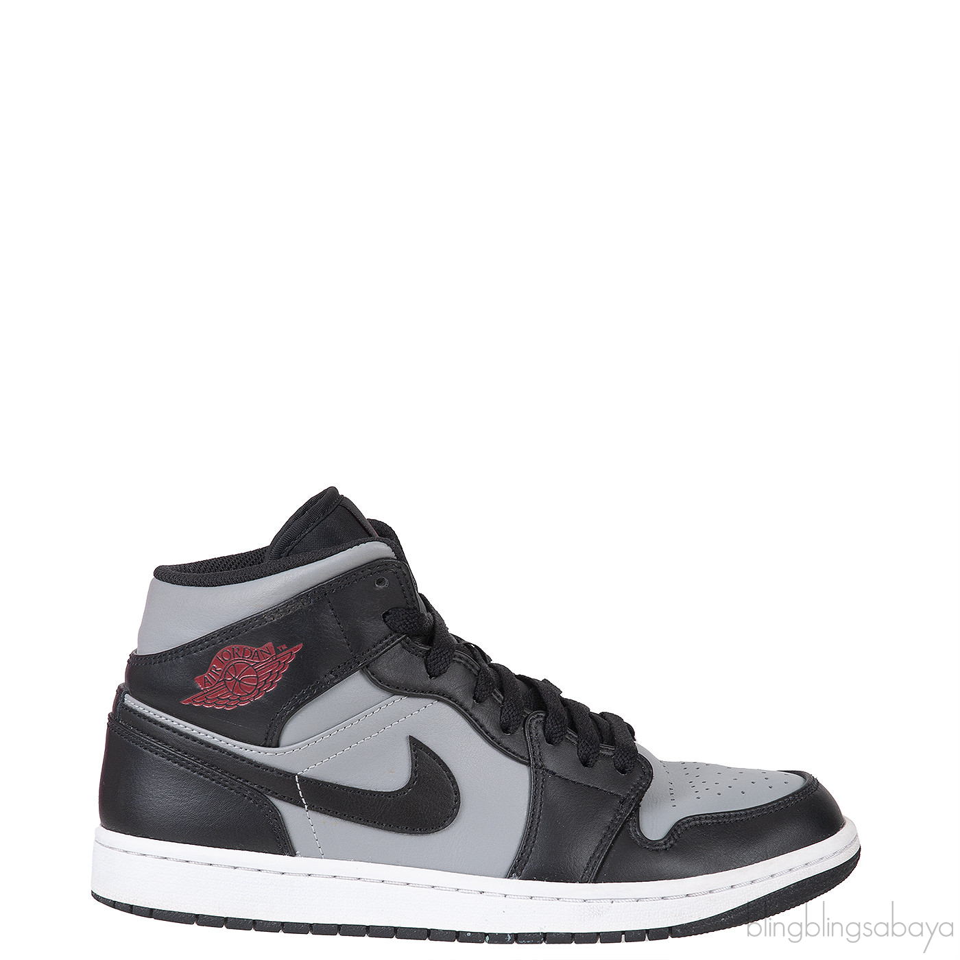 Air Jordan 1 MID "Shadow Red" Sneakers from NIKE!The Nike Air Jordan 1 MID "Shadow Red" sneakers are designed with a grey and black leather upper. They showcase a round toe, contrasting panel details, and a front lace-up fastening for a secure fit. The sneakers are highlighted by the classic Air Jordan Wings logo2 and the signature Swoosh logo2. Additionally, they feature a branded insole for added comfort and a durable rubber sole for traction and support.