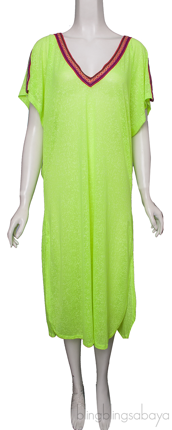 This Neon Green Cover Up from Pitusa is made from comfortable, lightweight neon green cotton and polyester mixed of fabric. This will be your perfect cover-up for your beach trips with v-neckline at front and back embroidered colorful trims and slit on both sides.