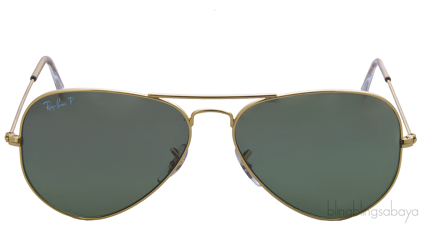 This RB3025 Aviator Gold Sunglasses from Ray Ban features a gold metal frames with metal handles, sweat bars, nose pads and aviator green lenses measuring 60 mm / Bridge: 14 mm / Arms: 130 mm.