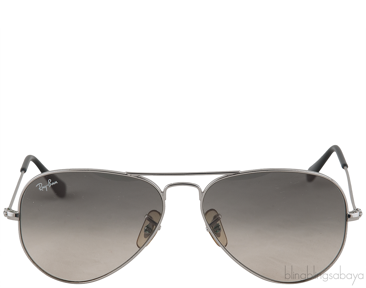 This 003/32 Aviator Sunglasses from Ray ban features a silver metal frames with metal handles, sweat bars, nose pads and aviator gradient grey lenses.