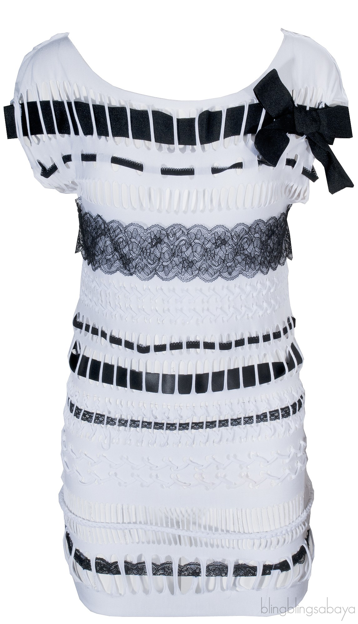 This Lace & Bow Cut-out Top from Red Valentino features a white soft fabric top with cut-out design at front, gross grain bow, ribbon and lace detailing at front, round neckline and has raw edges.