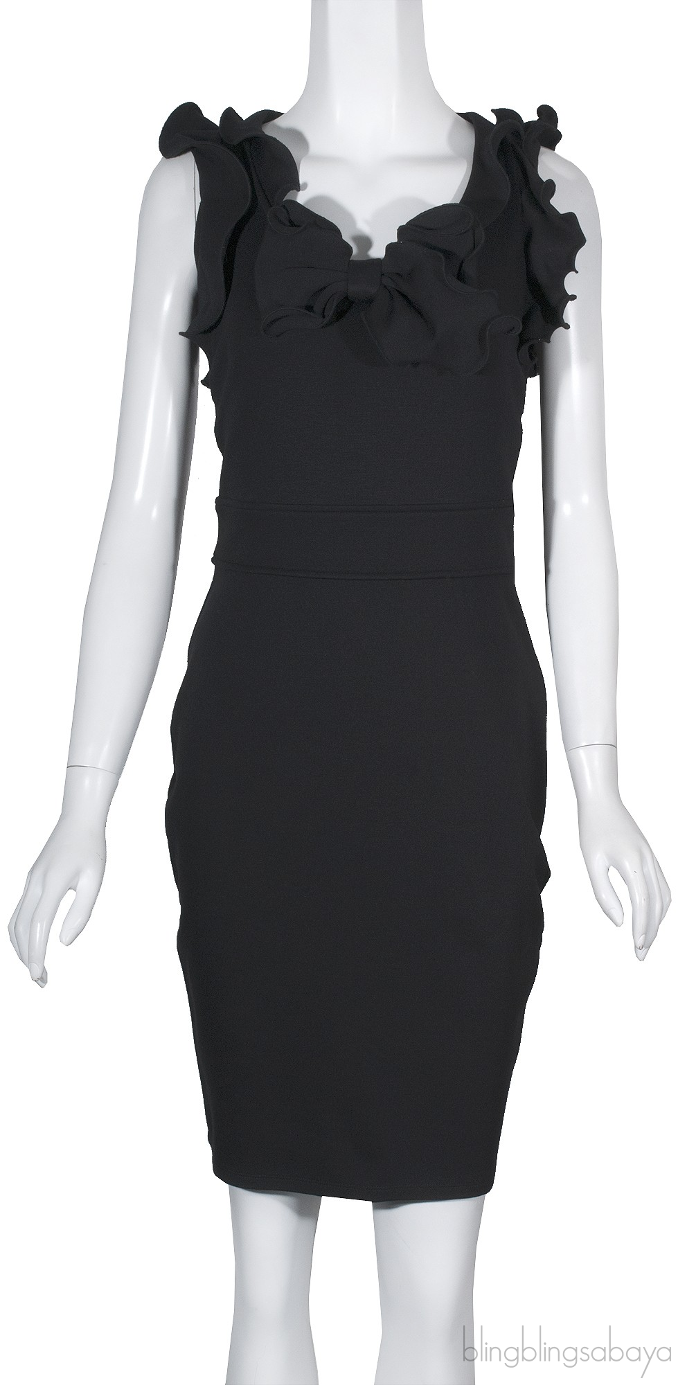This Black Ruffled Sheath Dress from Red Valentino is made in plain black stretched fabric featuring a round neckline, sleevelevess, fitted silhoute, zip fastening on the side and ruffled trimming on neckline and sleeves and has bow detailing at front underneath the neckline.