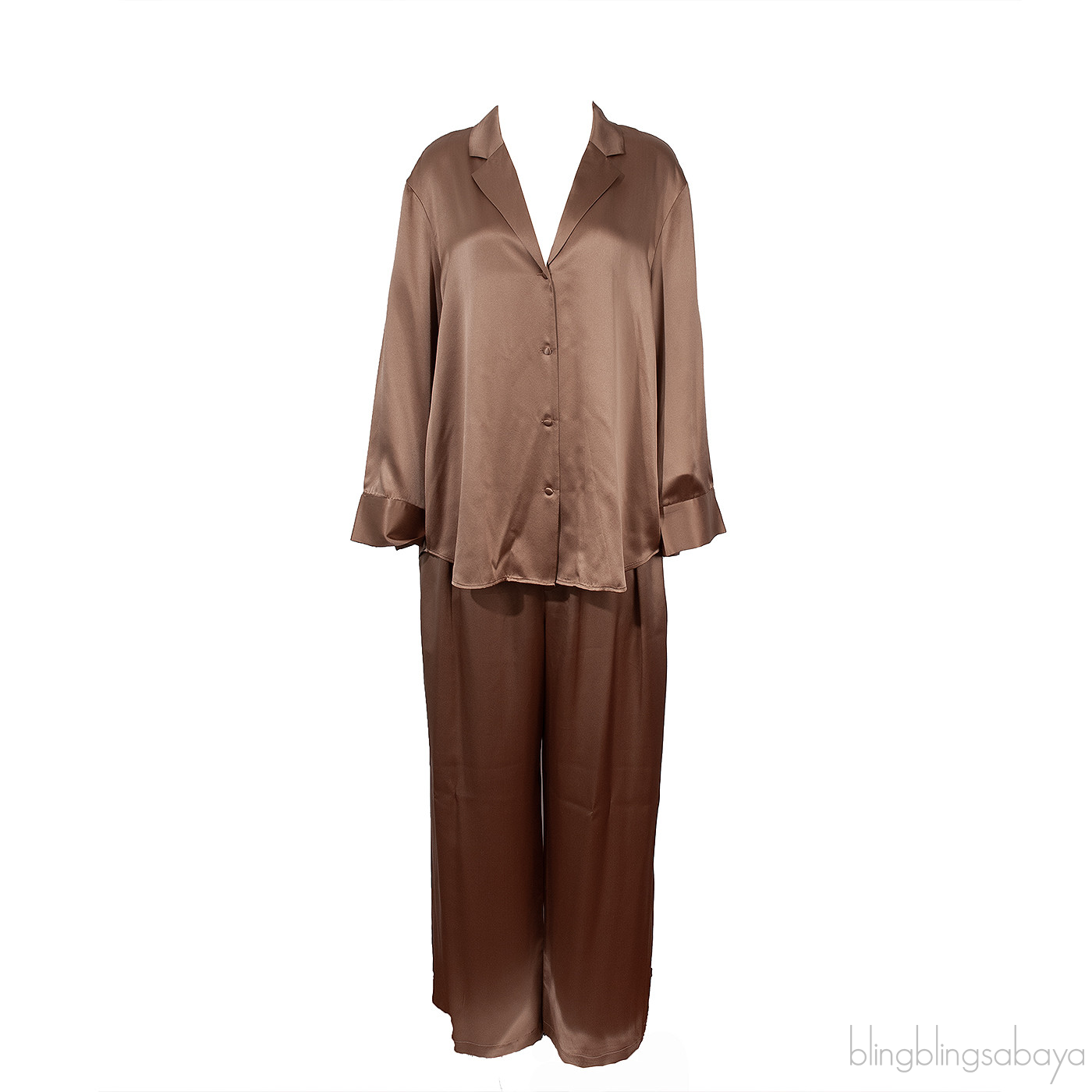 Brown Satin Trouser and Long Sleeve Shirt from REFORMATION!This pair of Brown Satin Trouser and Long Sleeve Shirt from Reformation is crafted from 100% Silk fabric in brown hue. Top features a classic collar, button fastening through the front, long sleeves with button cuffs. Trouser features a belt loops, side pockets, welt pocket design at rear, zip and fastening at front and straight leg design.