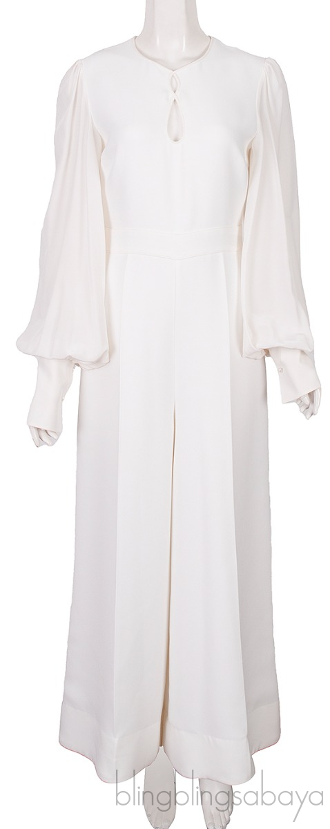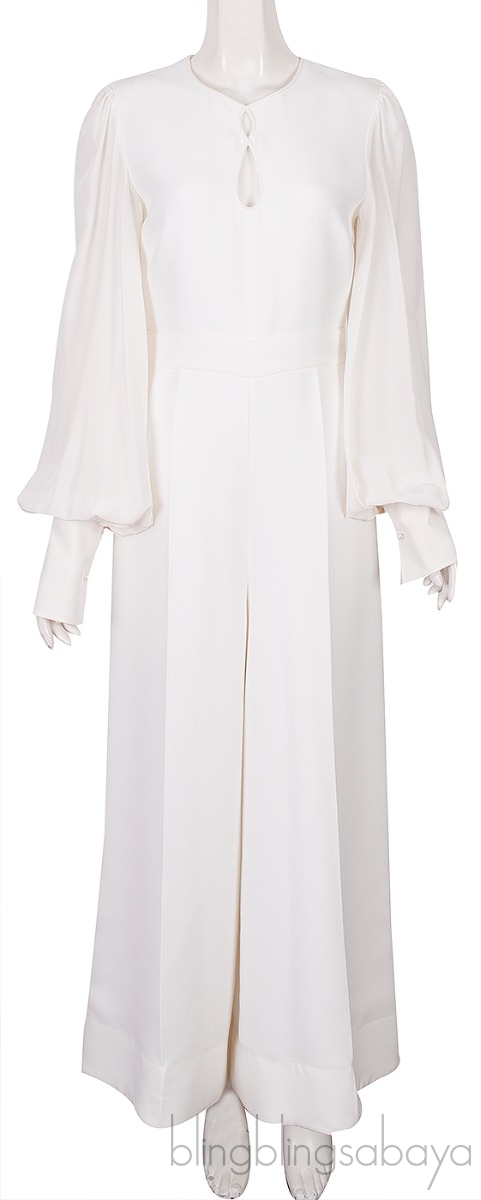 This Ivory Long Sleeves Jumpsuit from Roksanda is crafted 66% triacetate and 34% polyester. This jumpsuit features a round neck, keyhole front features, puff long sleeves, and pleated wide legs. conceals a zipper that zips up the back. Cuff buttons provide for closure and 100% silk lining.