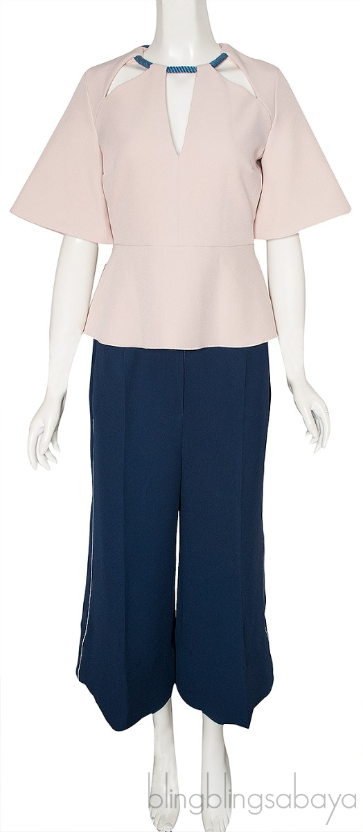 Peplum Blouse & Blue Wide Leg Trouser from Roksanda! Top is crafted from 97% Polyester and 3% Elastane featuring a cut-out design, rope detailing at neckline, short sleeves, peplum cut and zip fastening at back.