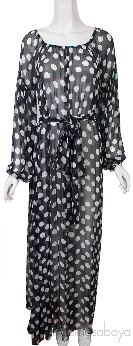 This Polka-dot Chiffon Nightdress from Rosamosario is crafted from 100& Silk chiffon fabric in black with white polka-dot. This nightdress features a bateau neckline, long sleeves with elastic cuffs, maxi length with detachable fabric belt.
