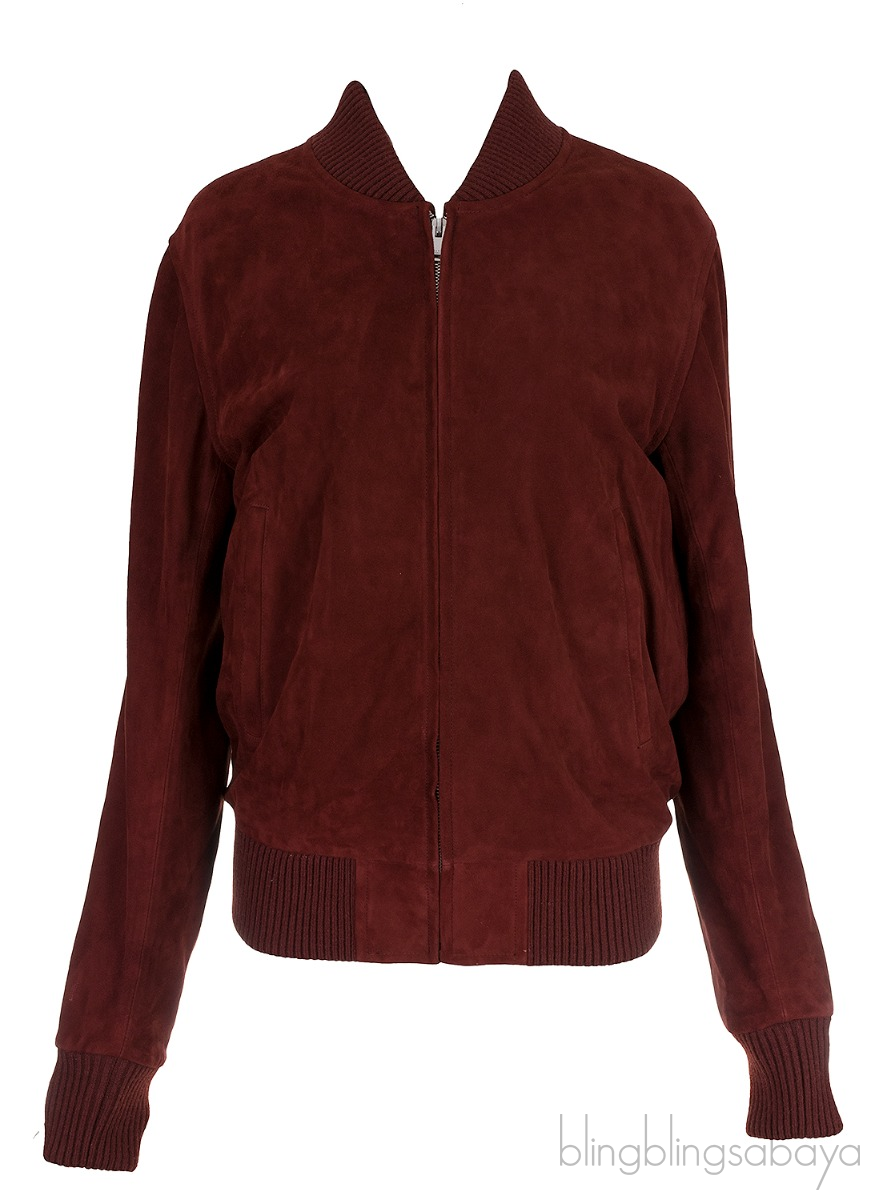 This Burgundy Suede Bomber Jacket from Sandro is crafted from brown suede 100% goat leather with 100% acetate lining. This jacket features a classic collar, long sleeves with ribbed cuffs, zip fastening through the front, 2 pockets at front with zip fastening, inside pocket and ribbed hemline