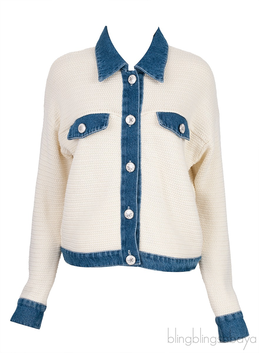 This Nino Knit Denim Jacket from Sandro is crafted from 100% Cotton in white knit fabric with blue denim trim. This jacket features a classic collar, with flap pockets are chest and side pockets, long sleeves and silver button fastening though the front.