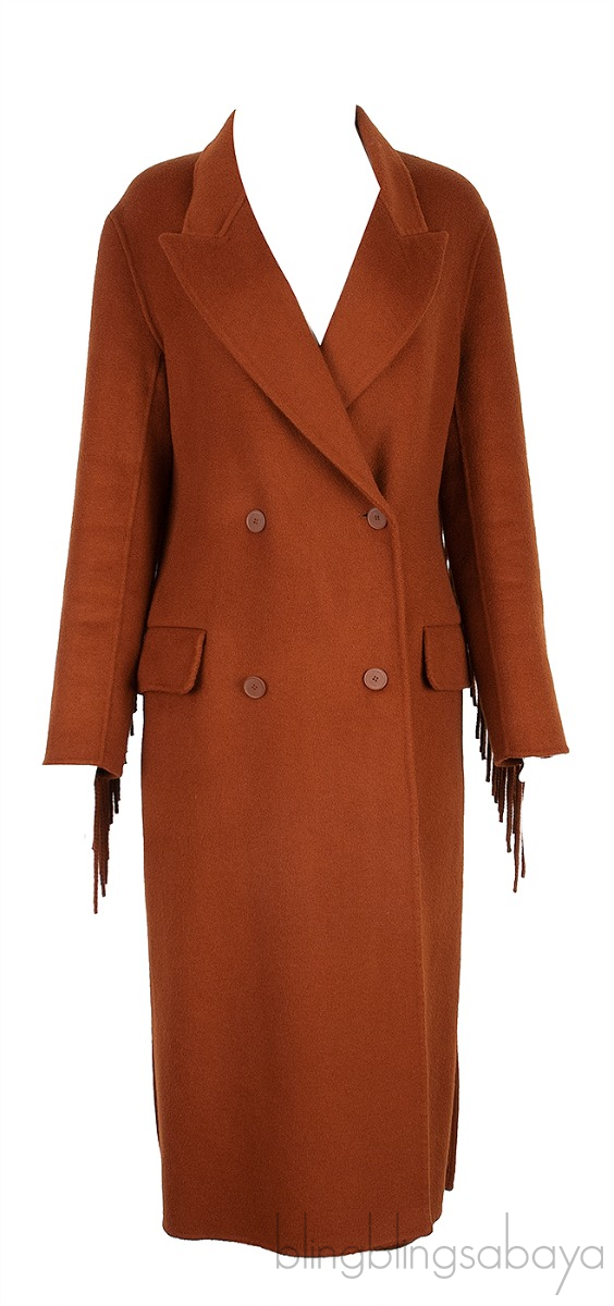 This Brown Hazeen Fringe Coat from Sandro is crafted from brown wool polyamide blend fabric. Featuring a double breasted button fastening at front, oversized cut, long sleeves, two flap pockets and long fringe at the back.