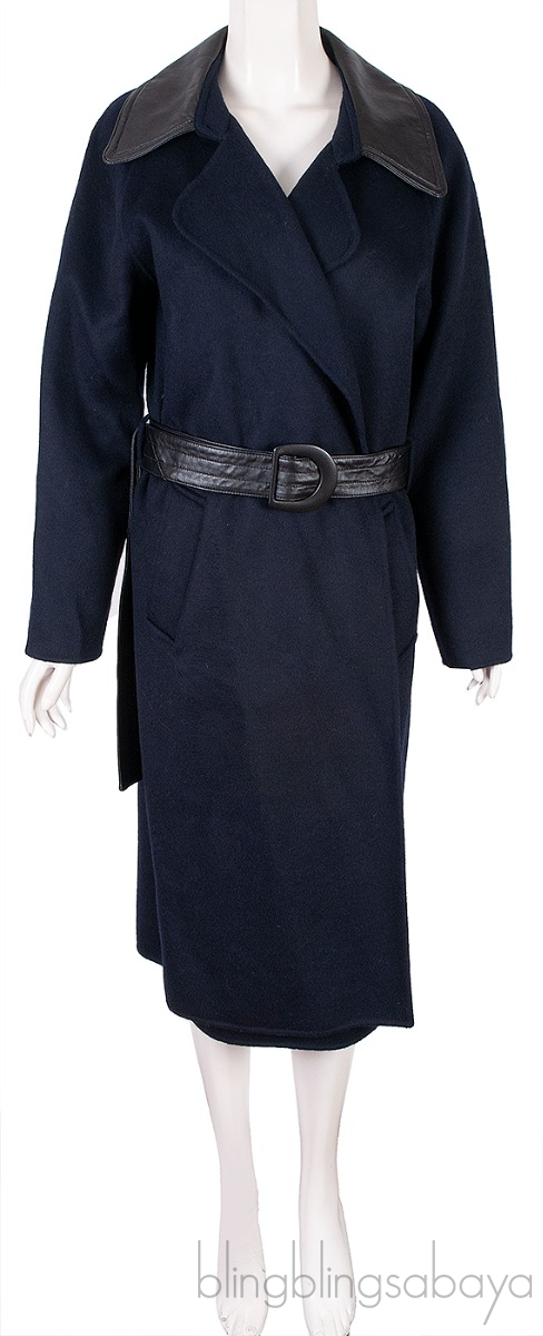 Sandro Blue Wool Leather Trim Trench Coat w/ Belt This Black Wool Leather Trim Trench Coat w/ Belt from Sandro is crafted from 80% Wool fabric and 20% Polyamide fabric. This coat features an open front, black leather collar, faux pockets at front, and comes with black leather belt with black buckle.