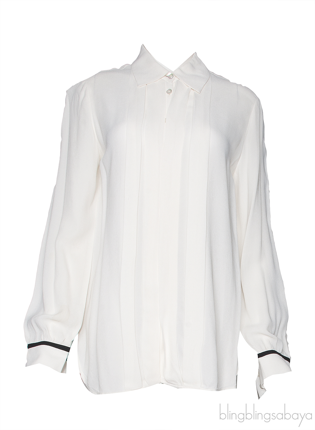 This Off-white Black Trim Long Sleeve Shirt from See by Chloe is crafted form 100% Viscose fabric in off-white color. This shirt features a classic collar, button fastening with pleats detailing to the front, long sleeves with black trim and buttoned cuffs.
