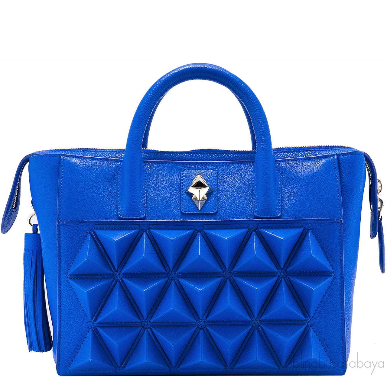 Known for its geometric sleek design, this bag features a funky pyramid design on the front with a golden metal logo2. It comes in two rolled leather handle and a dangling leather on the side. It has the top zip opening and interior is lined with coordinating blue lambskin leather with several compartment inside.