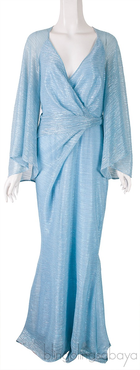 This Light Blue Metallic V-neck Gown from Talbot Runhof is crafted in 59% polyester, 41% metallic polyester; lining: 97% polyester, 3% elastane in light blue silver metallic hue. This dress features a wrap-effect draped bodice with luttering bell sleeves, deep v-neckline, zipper fastening at rear and maxi length.